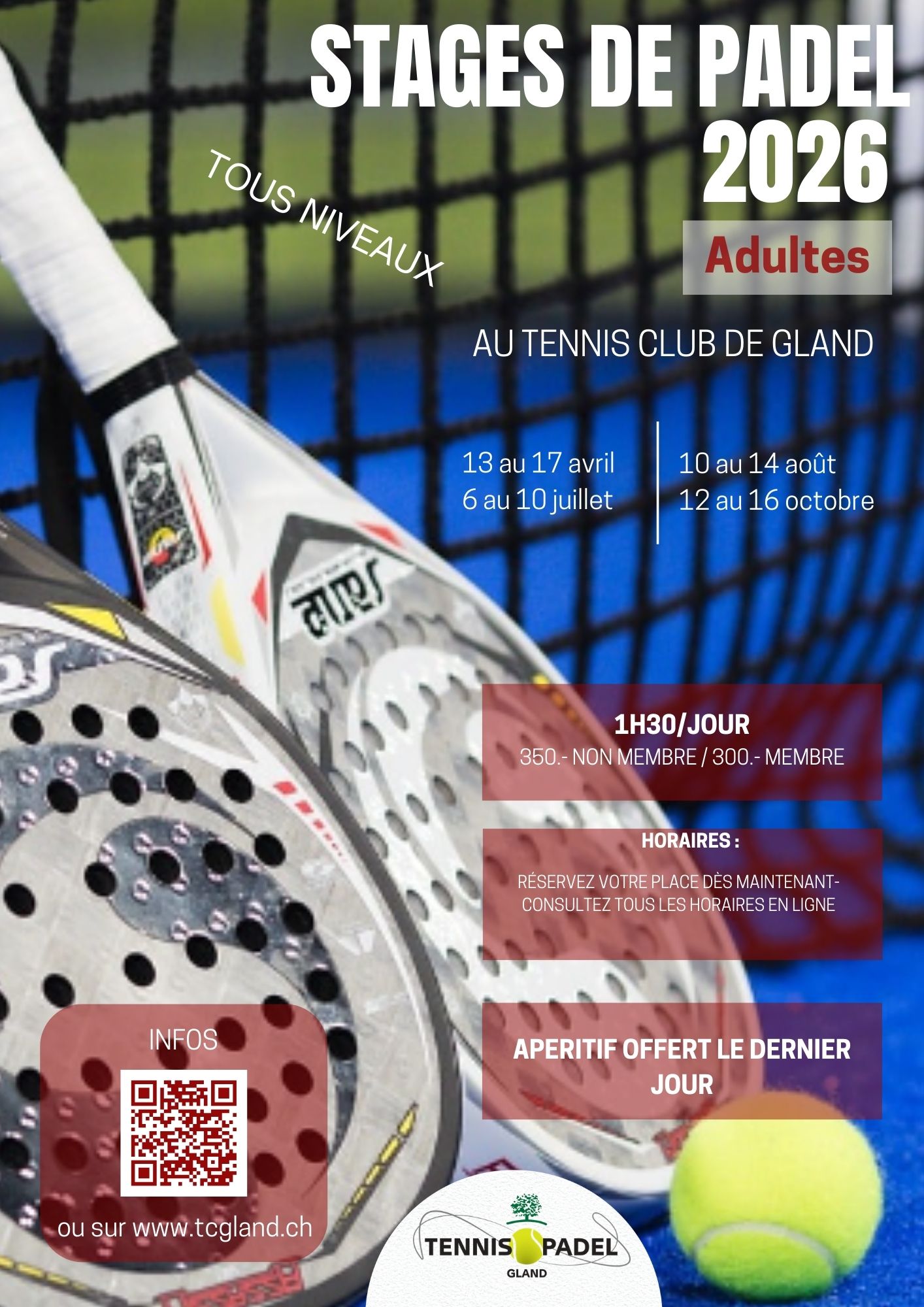 Tarif à l’année : 100.- (réservé aux membres) d’avril à mars. Inscriptions et informations au secrétariat du Tennis Club de Gland ou par téléphone 022 364 74 03